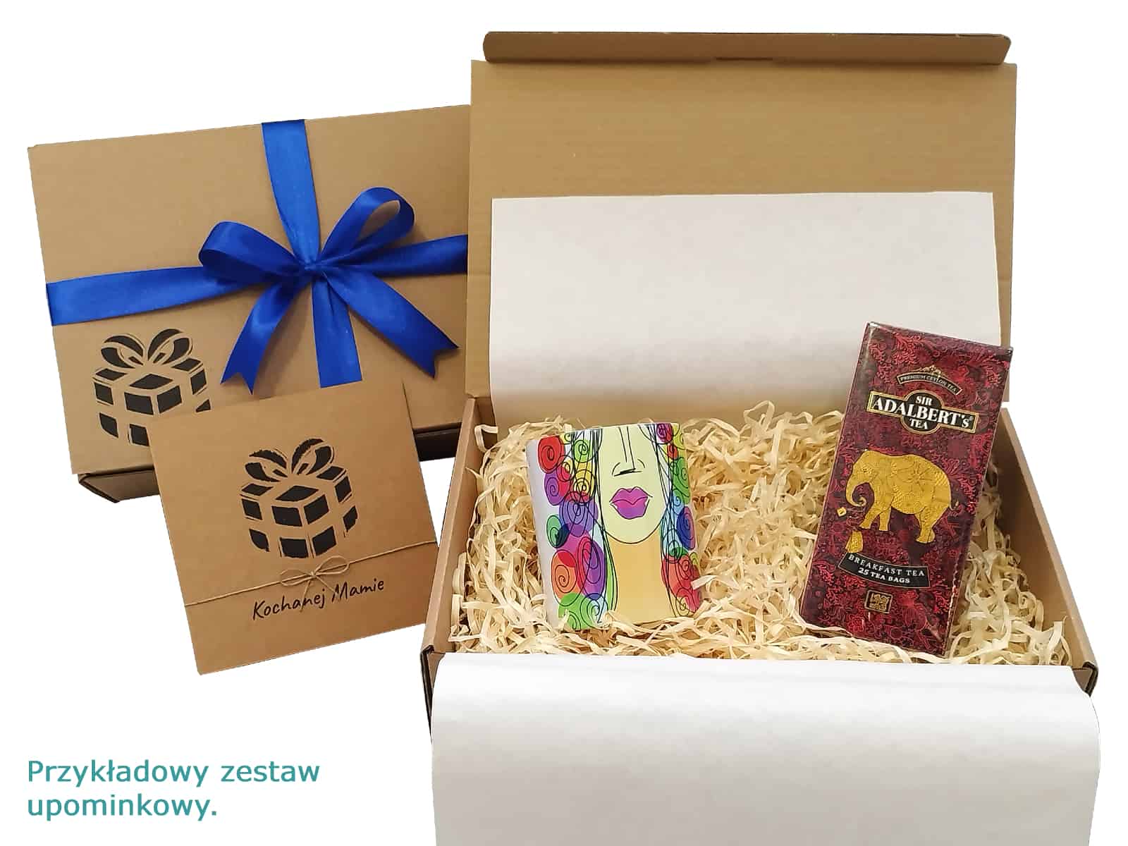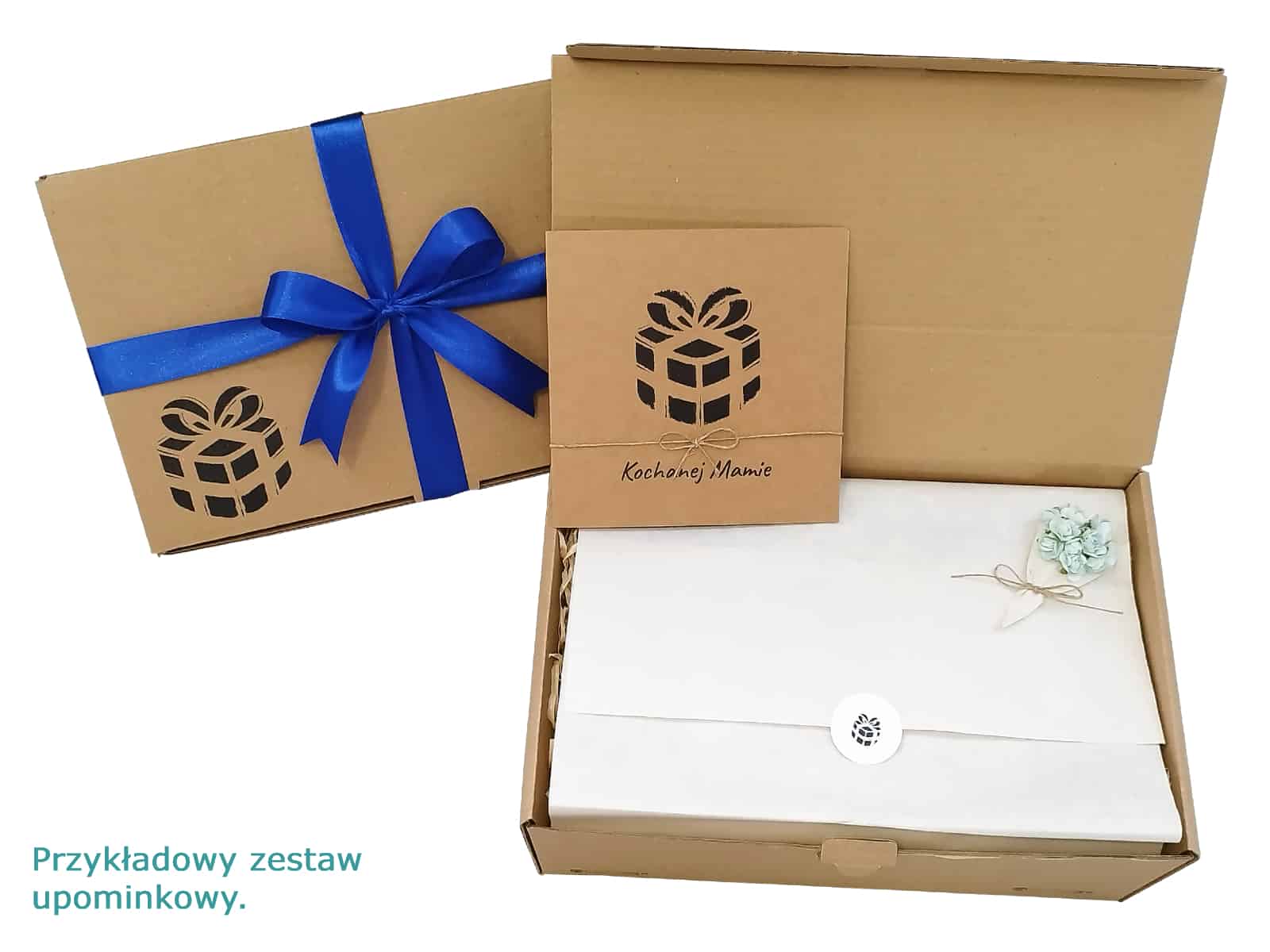 - opakowanie prezentowe wraz z ekologicznym wypełnieniem i ozdobną wstążką.