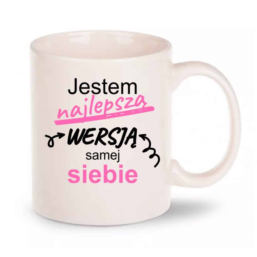 Zestaw motywacyjny z kubkiem („Jestem najlepszą wersją samej siebie”) to upominek, z którego ucieszy się każda kobieta, interesująca się rozwojem osobistym.